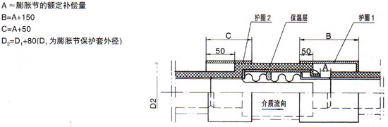 安裝直埋式膨脹節(jié)(不包括一次性直埋式)安裝時應(yīng)有兩個后年度護圈(如下圖),且護圈的壁厚不應(yīng)小于管道的壁厚,設(shè)置護圈1的目的是為管道受熱膨脹時,A尺寸范圍內(nèi)有土、砂等進入,圖中的各尺寸