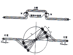 旋轉(zhuǎn)補(bǔ)償器的補(bǔ)償原理與鉸鏈型波形膨脹節(jié)相似,要用兩個(gè)或者兩個(gè)以上的補(bǔ)償器組合,利用其角位移的變化才能補(bǔ)償位移。兩者_(dá)的不同_是:鉸鏈型波形膨脹節(jié)是靠波紋管的變形產(chǎn)生角位移的,而旋轉(zhuǎn)補(bǔ)償器是靠旋轉(zhuǎn)管的旋轉(zhuǎn)產(chǎn)生角位移的,它需要一個(gè)力(由管道熱膨脹產(chǎn)生)和一個(gè)力臂形成一個(gè)力矩才能推動(dòng)其旋轉(zhuǎn)。因此,它不能與管道中心線同心,而應(yīng)與其垂直,這樣才能通過設(shè)置一個(gè)力臂連接兩個(gè)旋轉(zhuǎn)補(bǔ)償器。當(dāng)一端管道熱膨脹推動(dòng)力臂沿一個(gè)旋轉(zhuǎn)補(bǔ)償器旋轉(zhuǎn)時(shí)產(chǎn)生一個(gè)力矩,連接力臂另一個(gè)的旋轉(zhuǎn)波紋補(bǔ)償器產(chǎn)生一個(gè)反力矩,一對力矩大小相等,方向相反,形成力偶,達(dá)到力的平衡。