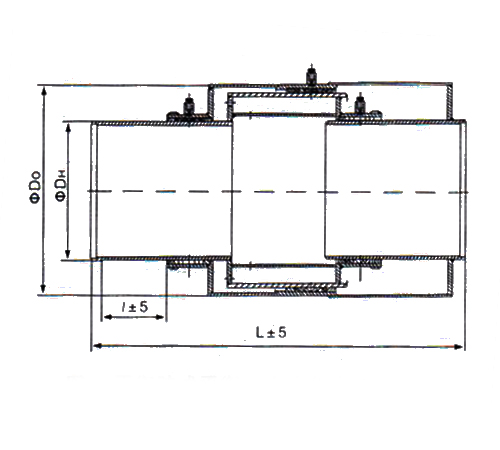 結(jié)構(gòu)特點(diǎn)是:采用三個(gè)填料密封箱;準(zhǔn)確的設(shè)計(jì)一個(gè)封閉流體環(huán)腔,利用流體靜壓力產(chǎn)生對(duì)兩側(cè)管道的拉緊力,抵消管道拐彎或盲端處固定支架上作用的流體推力。這種結(jié)構(gòu),由于流體直通式流懂,所以流體阻力損失很小,安裝長度短。