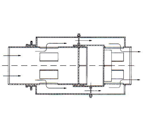 結(jié)構(gòu)特點(diǎn)是:外套管串聯(lián)兩個(gè)填料密封箱,內(nèi)套管后端加擋板,流體經(jīng)內(nèi)套管的孔道引到兩密封箱間隔腔,再經(jīng)外套管間隔腔處孔道,引回到后部加擋板的主管道。這種補(bǔ)償器比平衡腔式補(bǔ)償器減少一個(gè)密封箱,結(jié)構(gòu)簡(jiǎn)單,但比平衡腔型補(bǔ)償器重量大,安裝尺寸長。